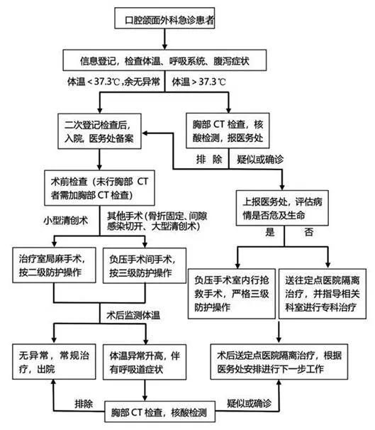 COVID-19病毒是一種新型病毒,對(duì)其生物學(xué)行為和由其導(dǎo)致的肺炎的治療,目前仍處于研究探索期,尚無(wú)明確的特效治療藥物。因此,對(duì)于口腔頜面外科急診治療而言,必須從源頭上做好防控,才能減少由醫(yī)療活動(dòng)造成感染和疫情擴(kuò)散的風(fēng)險(xiǎn)[10-11]。我院高度重視疫情防控工作,于1月20日成立了院長(zhǎng)擔(dān)任組長(zhǎng)的新冠肺炎防控工作領(lǐng)導(dǎo)小組,由醫(yī)務(wù)處牽頭,組織口腔頜面外科、麻醉科、手術(shù)室、護(hù)理部、感控科、設(shè)備器材科共同討論,制訂了口腔頜面外科急診患者收治醫(yī)療工作流程(圖1)。主要內(nèi)容包括:①明確需住院治療的急診患者僅包括嚴(yán)重頜面部間隙感染患者、頜面部挫裂傷患者,如不及時(shí)治療會(huì)危及生命,或者導(dǎo)致畸形、嚴(yán)重功能障礙且后期治療難度較大的頜骨骨折患者。②急診患者需先前往口腔醫(yī)院急診科,監(jiān)測(cè)患者及陪人體溫并填寫(xiě)疫區(qū)核查登記表,患者需確認(rèn)所填信息的真實(shí)性,存入病歷。③如果體溫>37.3℃,需前往指定醫(yī)院(第四軍醫(yī)大學(xué)唐都醫(yī)院)發(fā)熱門(mén)診進(jìn)行篩查,行胸部CT檢查與核酸檢測(cè),排除新型冠狀病毒感染后可繼續(xù)就診;④體溫正常且無(wú)疫區(qū)接觸史的患者方可進(jìn)入住院部,只允許1名固定陪人留院,住院部入口、病區(qū)入口設(shè)置兩級(jí)核查崗位,核查體溫及疫區(qū)核查登記表,符合要求方可進(jìn)入病區(qū),住院病房為單人單間。⑤入院后盡快完成術(shù)前準(zhǔn)備,患者均需要有術(shù)前胸部CT檢查結(jié)果方可安排手術(shù);簡(jiǎn)單清創(chuàng)手術(shù)可以在病房治療室完成,實(shí)施手術(shù)的醫(yī)護(hù)人員按二級(jí)防護(hù)級(jí)別操作;其余手術(shù)在負(fù)壓手術(shù)間完成,手術(shù)醫(yī)師、護(hù)士與麻醉師按三級(jí)防護(hù)級(jí)別進(jìn)行操作。全麻患者蘇醒后送至病房ICU進(jìn)行6~8 h隔離監(jiān)護(hù),情況平穩(wěn)后轉(zhuǎn)出至普通病房,監(jiān)護(hù)室護(hù)士需穿防護(hù)隔離衣。傷口換藥均在病房?jī)?nèi)進(jìn)行,醫(yī)生按二級(jí)防護(hù)級(jí)別操作。⑥鼓勵(lì)患者術(shù)后在房間內(nèi)進(jìn)行康復(fù)運(yùn)動(dòng),對(duì)患者及家屬進(jìn)行新型冠狀病毒的相關(guān)知識(shí)宣教,指導(dǎo)其進(jìn)行手衛(wèi)生。⑦術(shù)后評(píng)估患者情況,病情允許時(shí)盡早安排出院,縮短在院時(shí)間。