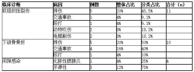 25例急診患者的病種主要為下頜骨骨折(含髁突骨折)、軟組織挫裂傷、口腔頜面部間隙感染。其中,軟組織挫裂傷11例,占44%;下頜骨骨折10例,占0%;間隙感染4例,占16%。外傷患者中,意外摔倒致傷11例,交通事故致傷5例,暴力傷害致傷2例,操作電鋸意外致傷2例,動(dòng)物咬傷2例;間隙感染患者中,牙源性感染3例,化膿性腮腺炎感染擴(kuò)散1例(表2)。