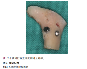 1.1.4??植入過(guò)程? 在髁突后斜面的下邊緣處分別植入傳統(tǒng)的和改良的錨固螺釘,深度10~15mm。2個(gè)錨固螺釘放置對(duì)稱,其間距>3mm(圖2)。