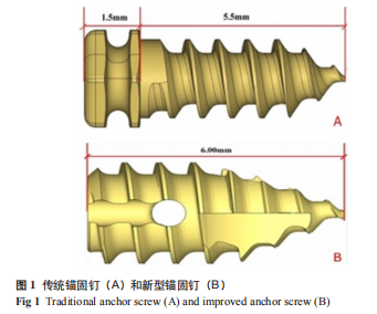 1.1.2??錨固釘? 傳統(tǒng)錨固釘和新型錨固釘(寧波慈北醫(yī)療器械有限公司)均由鈦合金制造。傳統(tǒng)錨固釘?shù)目傞L(zhǎng)度為7.0mm,其中螺母厚1.5mm、螺紋長(zhǎng)5.5mm、螺母直徑2.8mm、螺紋直徑2.0mm,在螺母頭和螺紋間采用光滑連接,此處設(shè)計(jì)有一個(gè)3-0縫線專用的小槽(圖1A)。新型錨固釘總長(zhǎng)度為6.0mm,直徑3.0mm,在錨固釘?shù)闹猩喜坑幸粋€(gè)小孔,小孔兩側(cè)上方設(shè)計(jì)有光滑的凹槽,用于放置和打結(jié)縫線(圖1B)。