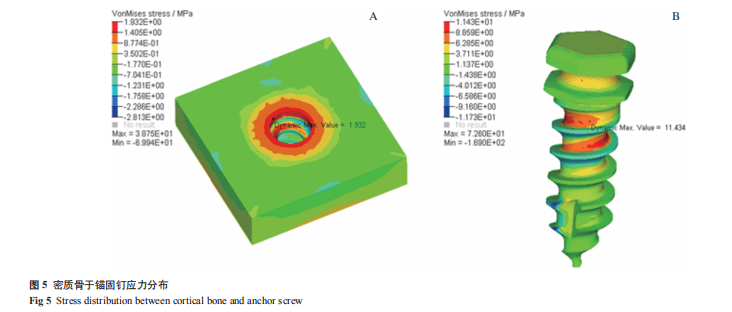 在三維有限元研究中,本研究對(duì)2種錨固釘施加相同類型和大小的力。此外,通過(guò)建立標(biāo)準(zhǔn)化模型,避免了不同個(gè)體間的誤差。當(dāng)施加垂直向應(yīng)力時(shí),由于錨固釘在軸向旋轉(zhuǎn)受限引起相當(dāng)大的摩擦力,將錨固釘軸向拉出時(shí)則需要更大的力量。對(duì)于水平力,橫向力大小與力臂之間存在反比例關(guān)系。由于錨固釘是一種非對(duì)稱結(jié)構(gòu),在側(cè)向力變化后,側(cè)向拔出力會(huì)略有不同。當(dāng)給出垂直拔出力時(shí),錨固釘與骨之間的摩擦系數(shù)被假定為接近無(wú)窮大,因此縱向拔出力通常比較大。此外,由于錨釘和骨都有較小的摩擦系數(shù),且錨釘主要是在較弱的松質(zhì)骨中被植入,繼而幾乎無(wú)法抵抗錨釘旋轉(zhuǎn)的發(fā)生。因此,一個(gè)小的縱向張力就可以使錨釘脫落。本研究對(duì)2種螺釘施加了完全相同的條件,因此可有效模擬錨釘在應(yīng)力狀態(tài)下的真實(shí)情況。